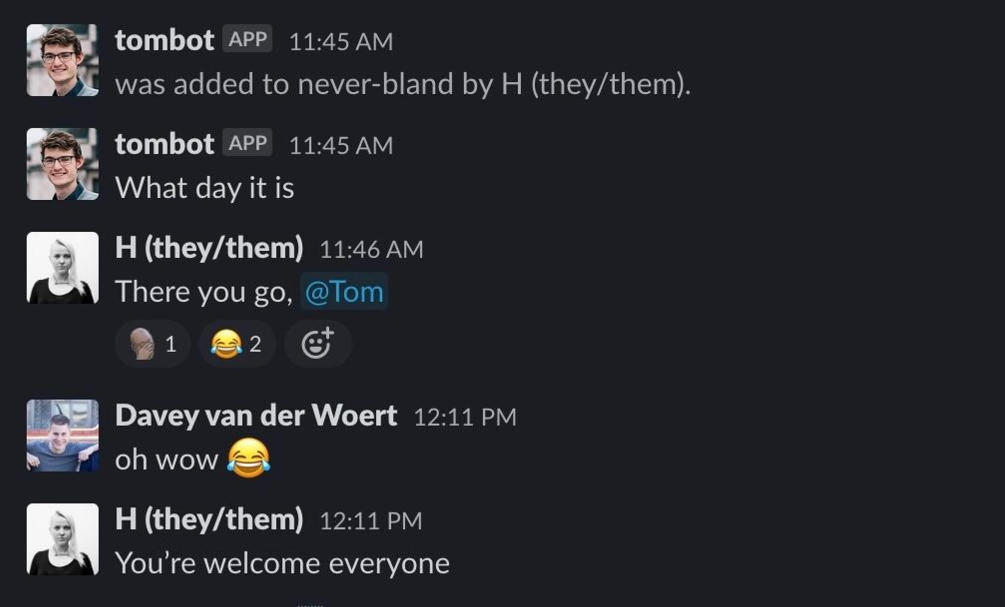Now if you’ve seen any of my work, you’ll know I love to build bots for Slack. Usually I ensure they automate as many tasks as possible in order to streamline internal workflow. But enough of the fancy words because the reality is I love nothing more than a bot that’s totally and utterly useless. I was inspired by my colleagues attempt to get Slack to tell everyone what day it is each morning. Instead he got Slack to tell us the words “what day it is” each morning, which I found deeply moving on a spiritual level. After being asked to build a bot to achieve this, I helpfully created a bot that not only regularly tells everyone the words “what day it is”, but also shares my colleagues love for peanut butter. I hope he’s grateful for the hard work I put into creating this masterpiece.